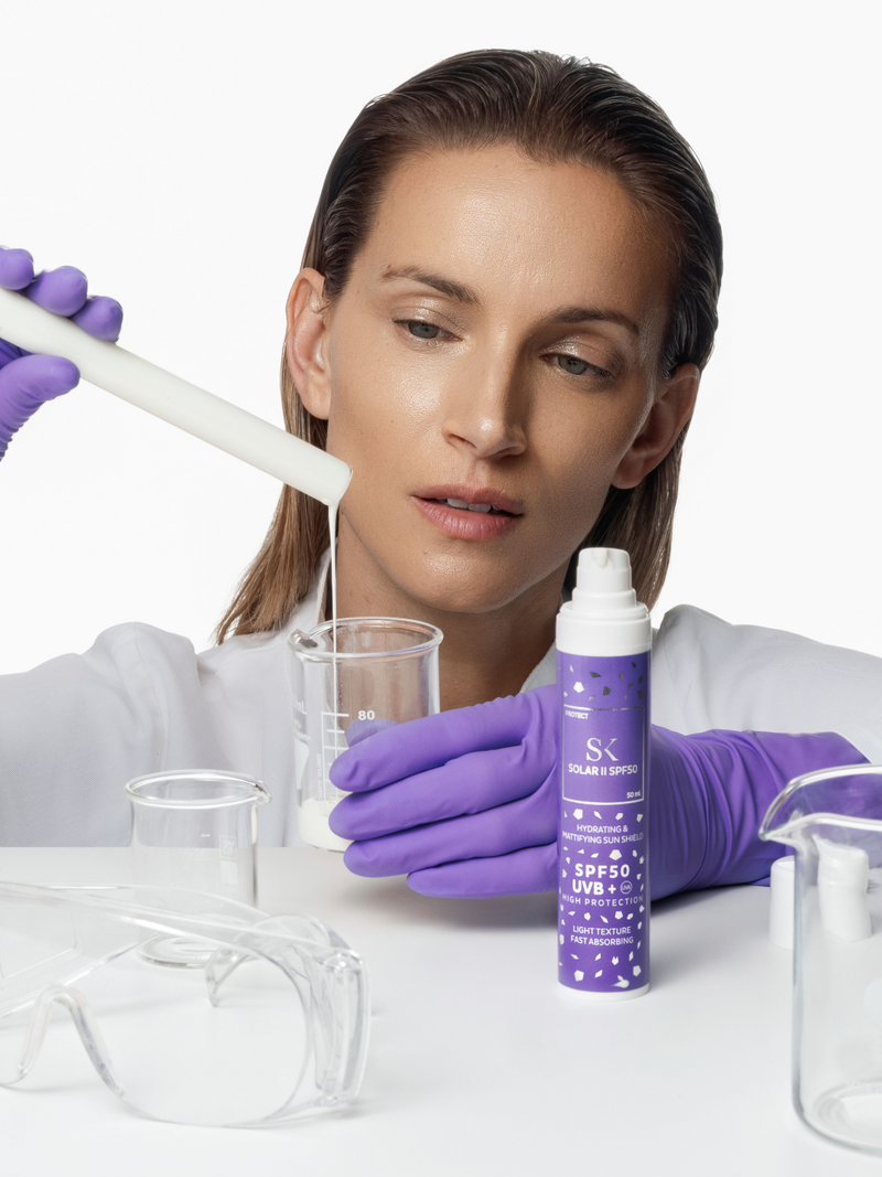Skintegra Solar II SPF50 hidratizirajući fluid za kožu lica sa UVA i UVB zaštitom ispred žene u laboratoriju